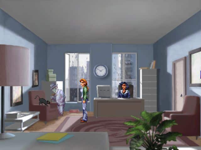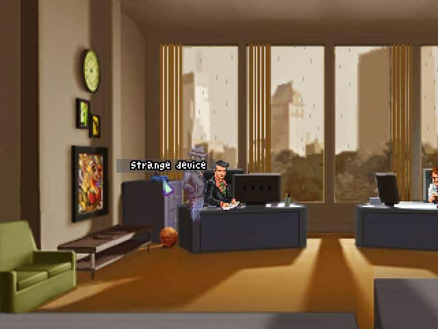 • Gdy gra zapyta czy zostajemy lub wychodzimy, wybieramy pierwszą opcję. Joey zostanie i podsłucha dwóch mężczyzn. Jako pan Mallone, klikamy na dziwnym niebieskim urządzeniu koło biura Paula, aby zakłócić działanie sieci. Następnie oddalamy się od rutera w celu przywrócenia połączenia. W konsekwencji, Paul zapyta Charlesa o hasło (Tennis53).