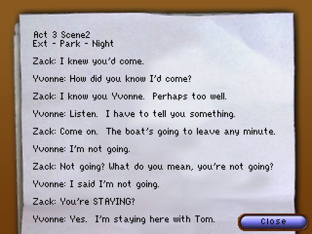 • Rozmawiamy z Frankiem jako Rosa. Mężczyzna myśli, że panna Blackwell to aktorka i kręcą razem film. Należy wybierać kwestie pasujące do scenariusza. Rosangela wciela się w Yvonne. Jeśli nie pamiętamy tekstu, jest on dostępny w schowku. Kiedy się pomylimy, możemy sprawdzić tekst i rozpocząć rozmowę od nowa. Uwaga! Kwestie dialogowe nie wyglądają identycznie jak linijki skryptu. Trzeba kolejno: spytać w jaki sposób wiedział; powiedzieć mu, że jest martwy; poinformować, że nie idziemy z nim; powtórzyć jeszcze raz; wymienić imię Tom.