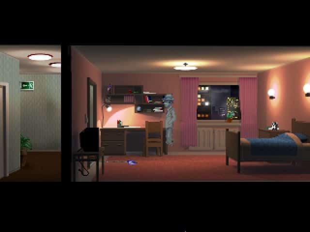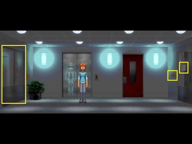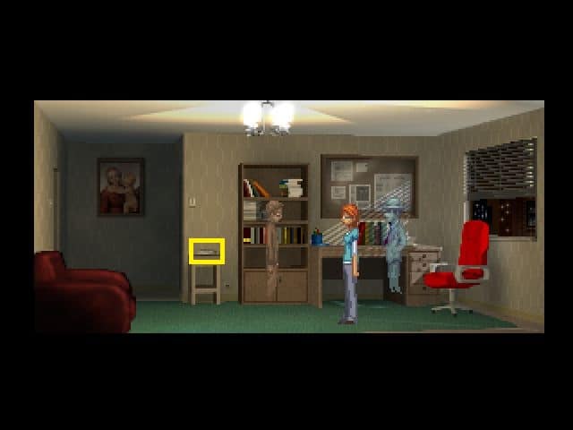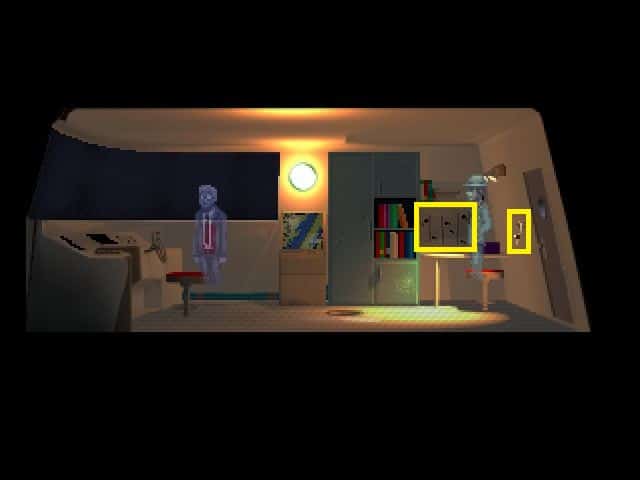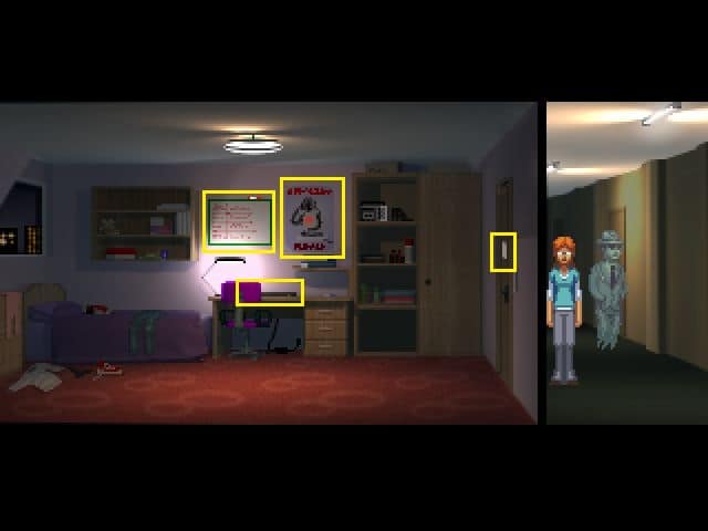- Kiedy znajdziemy się wewnątrz pomieszczenia, pojawi się duch jakiegoś mężczyzny. Zanim zaczniemy konwersację, klikamy najpierw na diagramie nad biurkiem (pomiędzy drzwiami a szafą), aby przyjrzeć mu się z bliska.