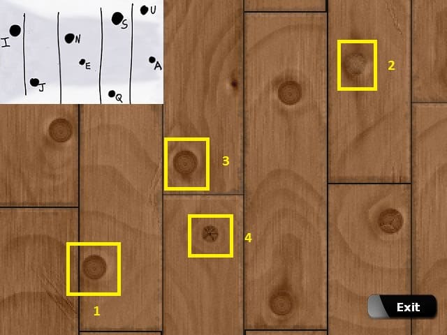 - Kiedy ujrzymy ścianę z bliska, należy kliknąć na czterech punktach w takiej kolejności jak na poniższym obrazku. Na rozwiązanie tej zagadki naprowadza jedno z dwóch imion wyrytych na boku łodzi (JUNE) oraz diagram z kabiny z duchem, na którym widnieją kropki z przypisanymi im literami.