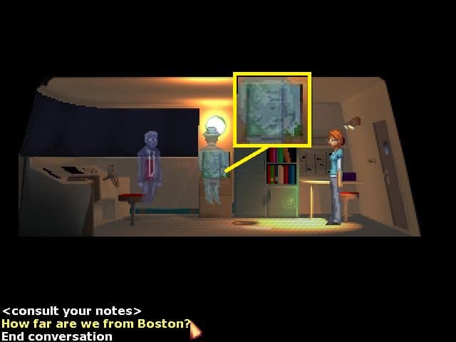 - Rozmawiamy z duchem nawiedzającym łódź i pytamy go o napad na bank (temat z notatnika). Możemy też poruszyć inne tematy z notatek. Następnie zamykamy okno z tropami i poruszamy temat Bostonu ze standardowej listy dialogowej. Na koniec pytamy jak daleko jesteśmy od Bostonu.