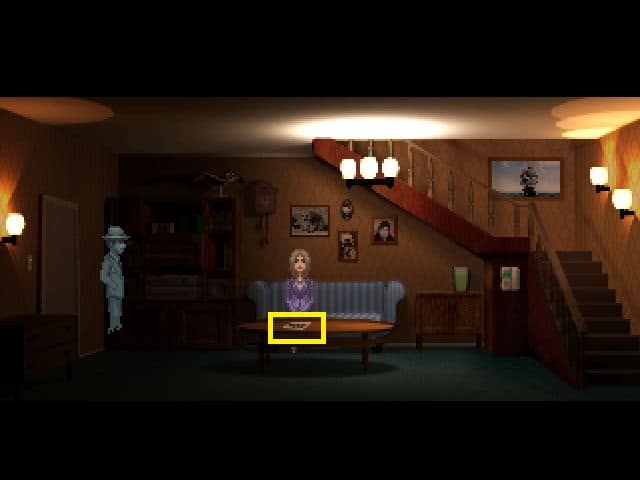 - Na stoliku przed kanapą leży fotografią, na którą dmuchamy przy pomocy umiejętności podmuchu z ekwipunku. Gdy zdjęcie spadnie na podłogę, ponownie na nie dmuchamy. Dzięki temu przesunie się w lewo, a mianowicie do następnego pomieszczenia.