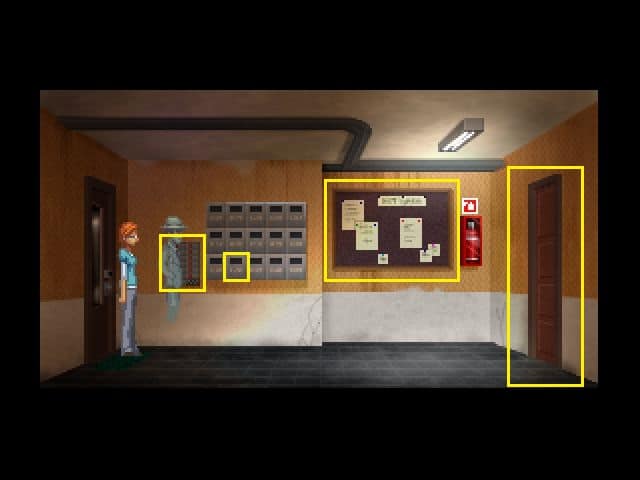 - Klikamy prawym przyciskiem myszy na tablicę informacyjną pomiędzy skrzynkami pocztowymi a gaśnicą. Panna Blackwell zainteresuje się jedną kartką, którą po chwili zobaczymy z bliska. Czytamy treść wiadomości informującej, iż imię własnego psa nie jest bezpiecznym hasłem do zabezpieczenia komputera. Wskazówka z owej kartki przyda się w późniejszym fragmencie rozgrywki (w sprawie Jamie Graham).
