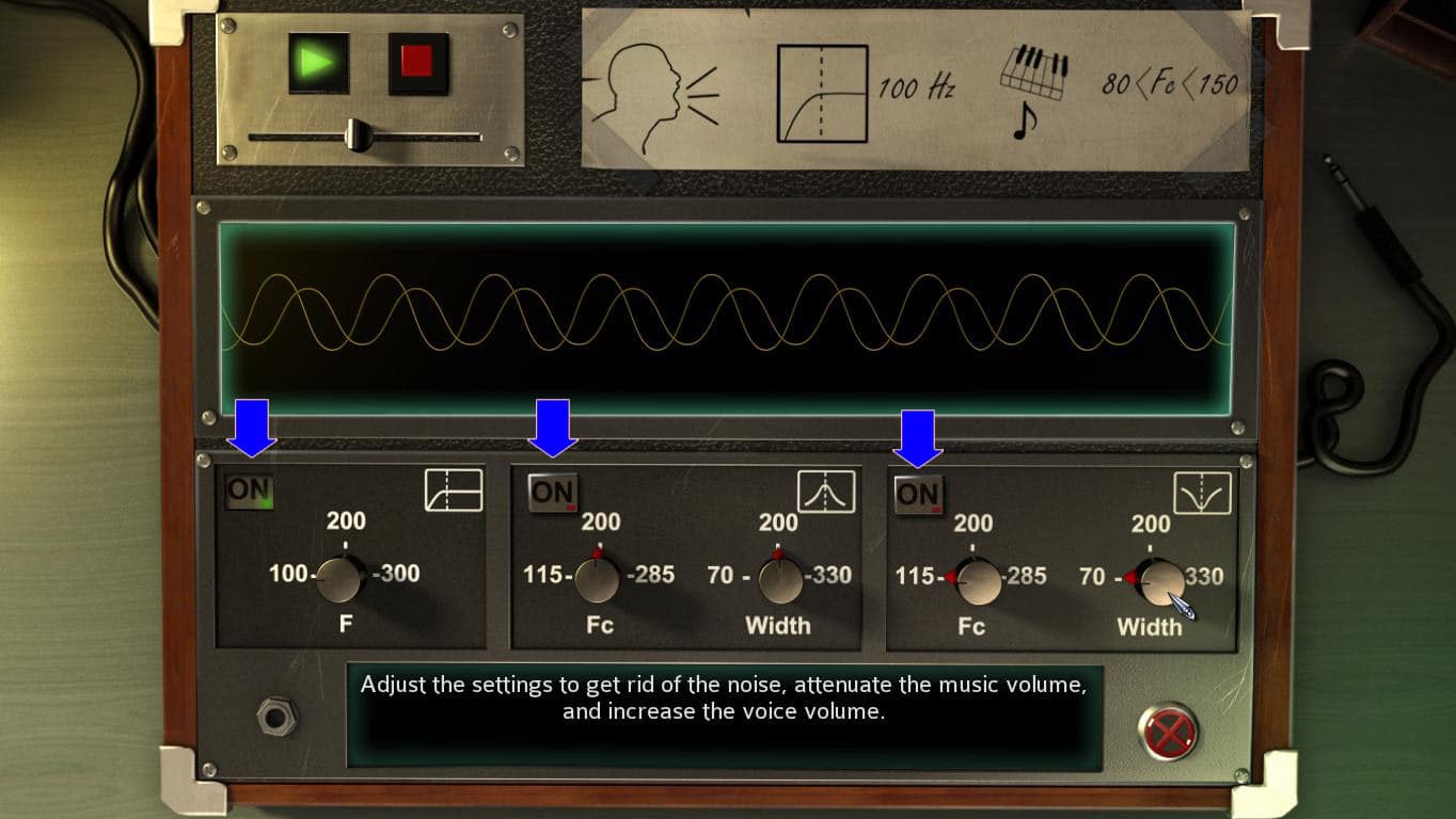 - Należy wyregulować odbiór. W tym celu, naciśnij na zielony przycisk PLAY, a następnie pokrętłami kręć w taki sposób, aby czerwone wskazówki umieszczone były na liczbach: 100, 200, 200, 115, 70 – licząc od lewej. Wszystkie ustawienia zatwierdzamy przyciskami ON.