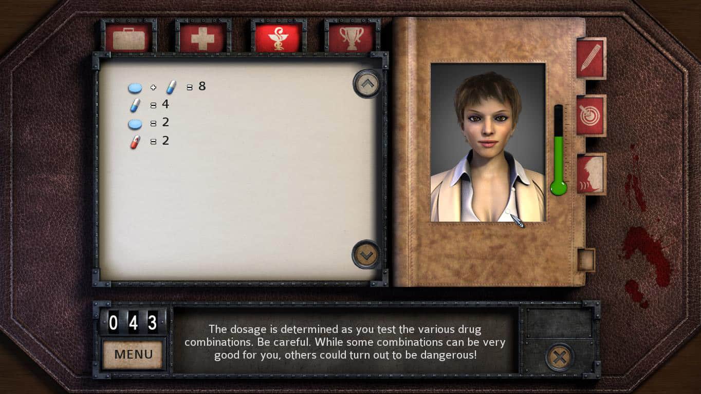 - Kliknij na Inwentarz oraz na zakładkę z białym krzyżem. Do wyboru jest kilka tabletek, zaś po prawej stan zdrowia głównej bohaterki. Oczywiście pasek musi przybrać jak największy poziom i być zielony.