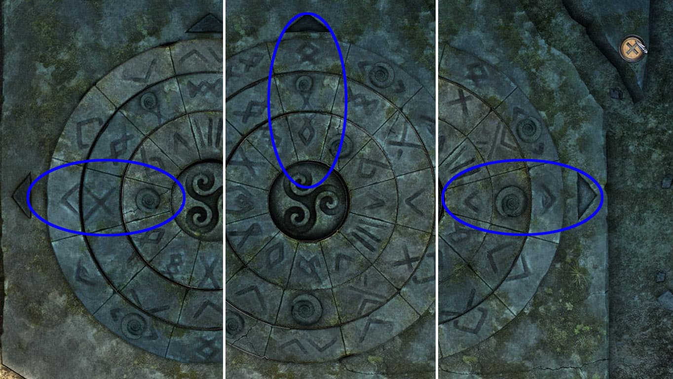 - Na płycie zauważysz strzałki wskazujące każde z kamiennych drzwi. Twoim zadaniem jest ułożyć symbole widniejące przy każdym z nich.