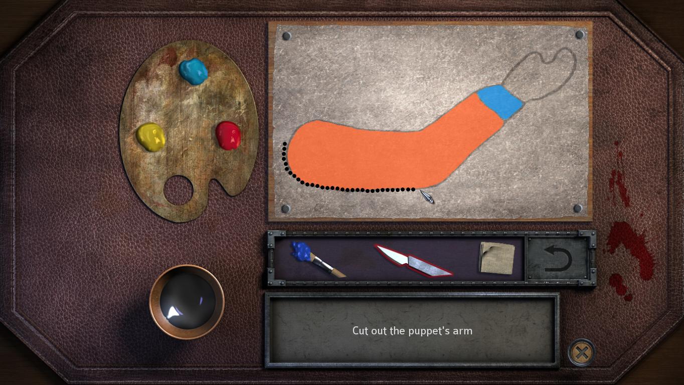 - Spójrz teraz na teatrzyk z papierowymi postaciami. Kliknij na ostatni klucz, a jedna z kukiełek spadnie na ziemię. Podnieś ją.