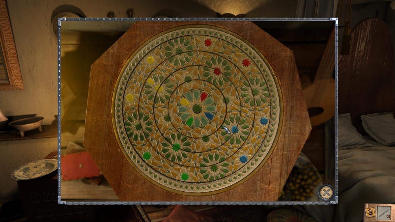 - Poszczególne okręgi obracasz wokół własnej osi przy pomocy środkowych przycisków. Dwa guziki po lewej i prawej służą do przekładania poszczególnych płytek. Ułóż poprawnie symbole, jak zostało przedstawione na obrazku poniżej.