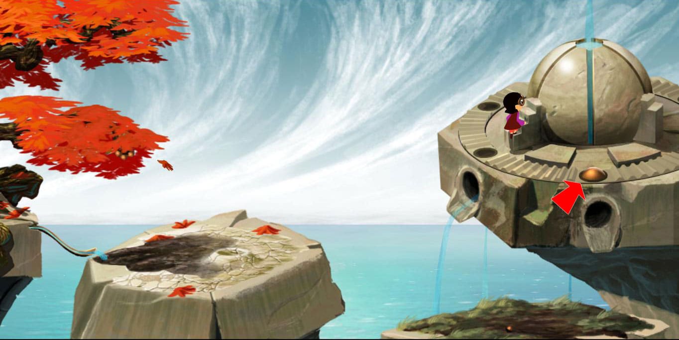 - Naskocz dwukrotnie na przycisk po prawej, a także jeden raz po lewej. Kula znajdzie się naprzeciwko Lilly blokując dopływ wody.