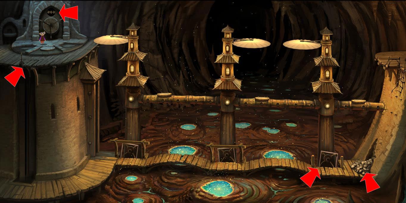 - Duża bańka: Wejdź na płytę i pociągnij wpierw za krótszą dźwignię przed Tobą. Teraz pociągnij dłuższą dźwignię nad głową bohaterki. Następnie pociągnij kolejno za krótką i długą dźwignie.