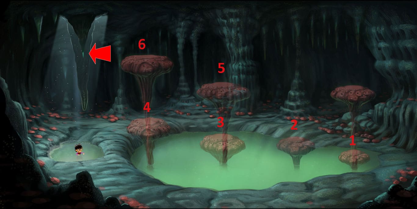 - Wejdź na brzeg. Musisz dobrać się do sopla wiszącego na suficie skacząc po grzybach.