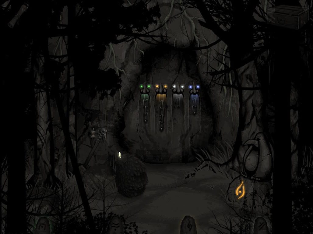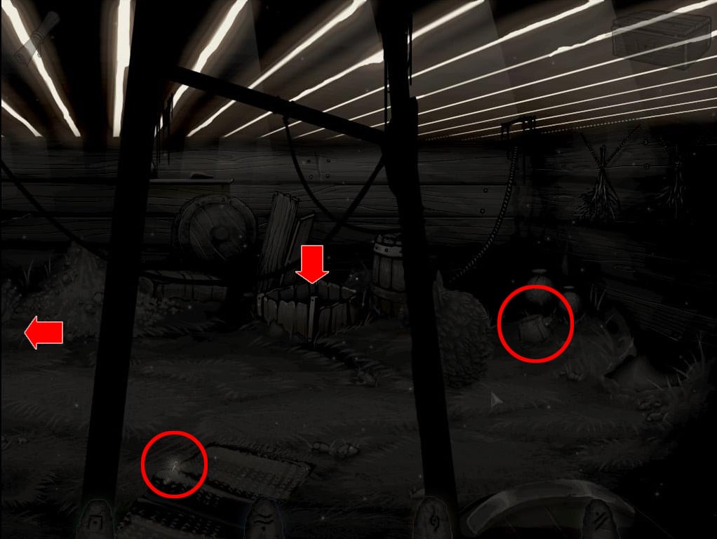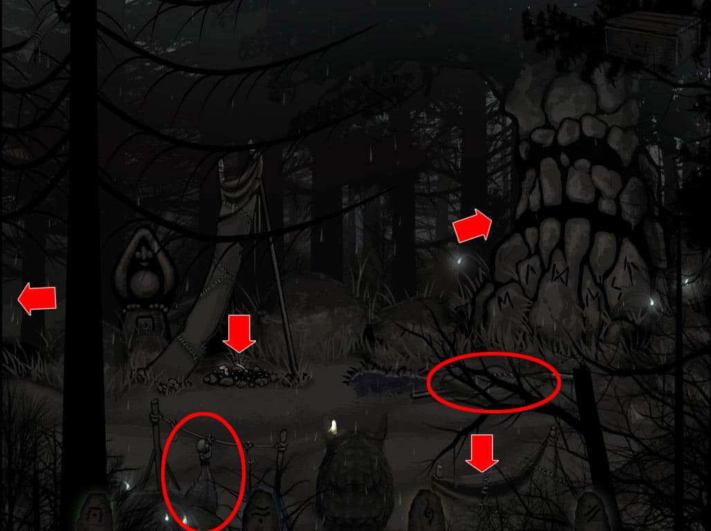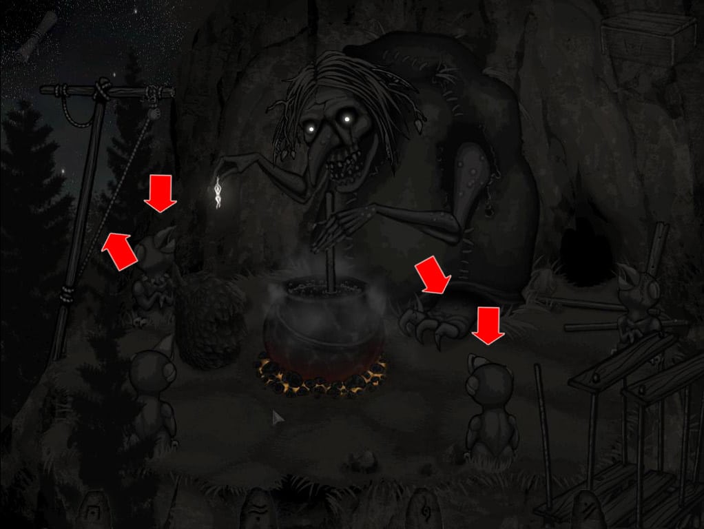 • Zabierz niezbyt świeży udziec mięsa zwisający na linie oraz metalową rurkę wraz ze szmatami po prawej. W palenisku zaś znajdziesz podkowę.