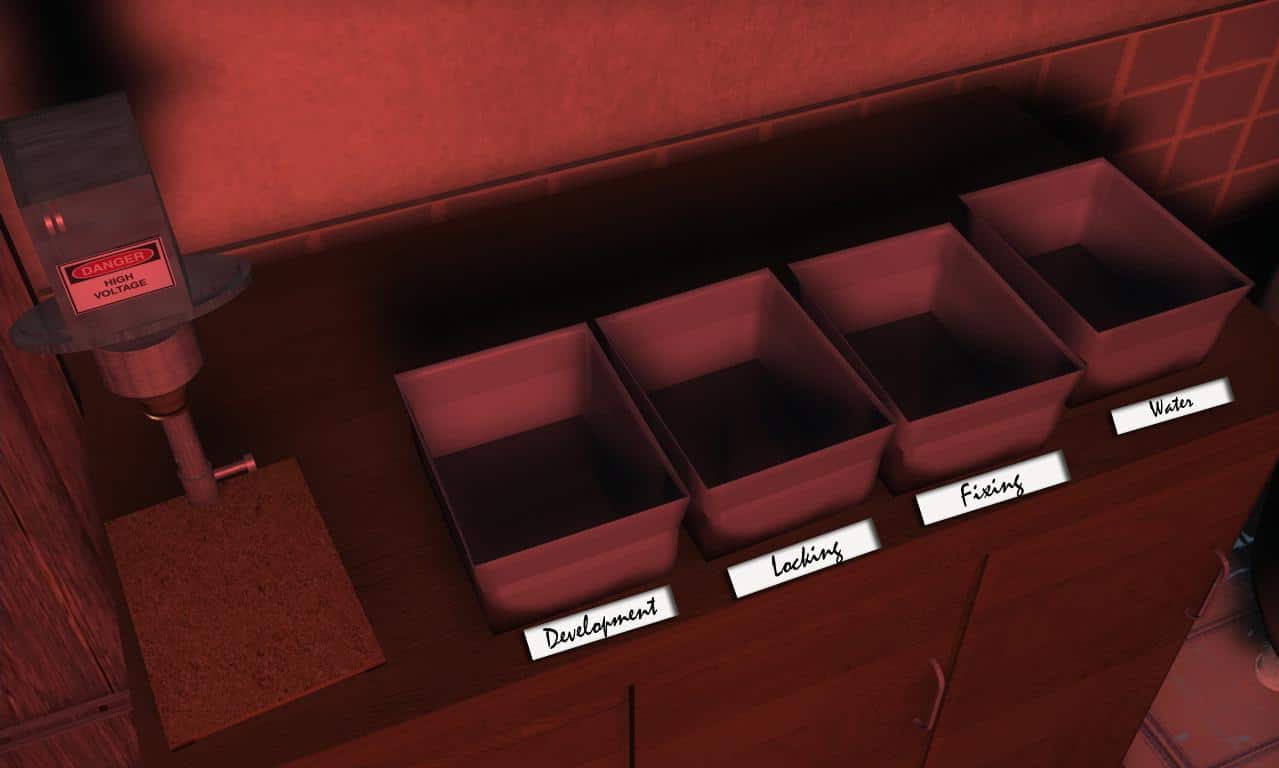 • Zabierz sztalugę po prawej oraz kilka przedmiotów ze stołu po lewej. Będzie to miska, film do aparatu, aparat, pudełko na kliszę, rolka, łagodny szampon, urządzenie powiększające oraz papier fotograficzny.