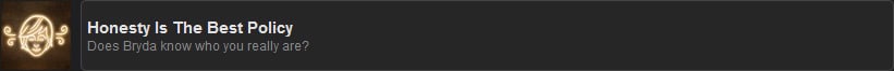- Talk to Bryda. It doesn’t matter which option you choose, but of you tell the truth, you’ll unlock the “Honesty Is The Best Policy” achievement.