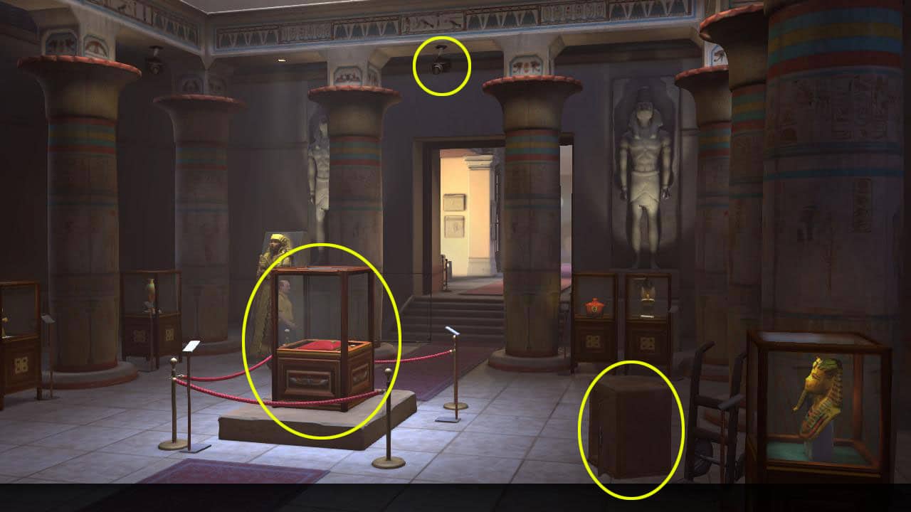 • Kiedy zostaniesz sam, przyjrzyj się gablocie po środku, a następnie zbadaj całe pomieszczenie – włącznie z kamerą znajdującą się nad wejściem.