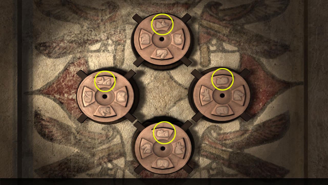 • Biegnij ponownie do głównego holu i przyjrzyj się czterem statuom z głowami zwierząt stojącymi obok posągów faraona.