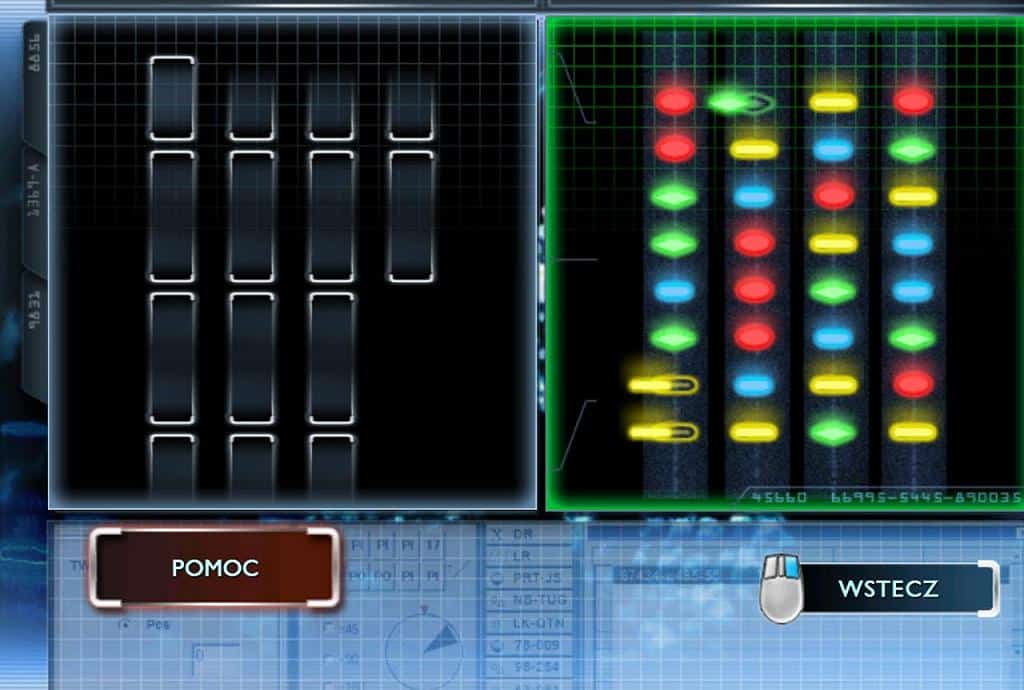 W tej części nie skorzystamy z dobrze wyposażonego laboratorium mobilnego. Nasza ulubiona stacjonarna pracownia dzieli się na dwie części, a w dodatku wiele elementów zostało w jakiś sposób ulepszone. Pierwsze stanowisko po prawej zawiera przyrządy służące do analizy materiałów. Jest ono zaopatrzone w mikroskop porównawczy posiadający różne stopnie przybliżenia (10, 60 i 200x) oraz regulator ostrości: należy właściwie dobrać wartość soczewki i wyregulować przyrząd jednym guzikiem, by obejrzeć przedmiot lub porównać dwie próbki, np. nitki. W tym samym mikroskopie znajduje się moduł do badań pisma: za pomocą trzech suwaków ustala się odpowiednie światło, by przeczytać tekst. Mamy tu również stół montażowy , który dalej służy do składania fragmentów. Ostatnim przyrządem jest chromatograf, który posiada dwie opcje: analizy DNA oraz innych substancji. Te badania są wybitnie ciekawe: materiałowi biologicznemu przyporządkowano czerwone, żółte, zielone i niebieskie kropeczki. Próbka pobrana z miejsca zbrodni to klocki powiązane w 2-6 elementowe nitki, które należy dopasować do którejś z całości należących do konkretnej osoby. Przykładowy proces przedstawiłam na obrazku obok.
