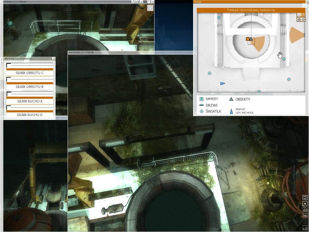 Dobrze, czas przejść do minusów, bo tych jest sporo. Największym jest… system monitoringu, czyli cały pomysł. Nie chodzi mi tutaj o fundamentalne pytanie czy komuś się to będzie podobać, czy nie, bo to kwestia sporna, a spróbować zawsze warto. W końcu czegoś takiego jeszcze nie było. Chodzi o samo wykonanie. Interfejs jest paskudny w obsłudze i to tak, że wspomniany Windows w wersji 3.11 był łatwiejszy i bardziej intuicyjny. Obracanie kamer, przeskakiwanie z obrazu na obraz strasznie psuje klimat gry. Zamiast wciągać się w niespokojną, tajemniczą aurę opuszczonego statku, klikamy z obrazu na obraz i nic naprawdę nie widzimy. Jest moment kiedy Lea widzi kościotrupa i zaczyna krzyczeć, bojąc się. Zanim ja zorientowałem się co się dzieje, było po wszystkim. Po prostu kilka chwil trwał obrót kamery i cała atmosfera prysła. Silnik graficzny nie wyrabia zaś z dużą liczbą okien i trzeba je zamykać, żeby potem znowu otwierać. Jest to męczące i na pewno dałoby się to rozwiązać lepiej.