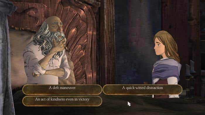 Scenariusz gry wygląda też bardzo dobrze pod względem zagadek. Nie są specjalnie trudne, ale do najłatwiejszych też nie należą (szczególnie pod koniec). Zachowują ten idealny balans, który jednocześnie wymaga dobrej uwagi, a zarazem sprawia, że akcja nie traci rozpędu. Jednocześnie gracz ma do wyboru trzy ścieżki, którymi może podążać lub mieszać je według uznania. Jedna wymaga odwagi, druga dobroci, a trzecia sprytu. Chociaż ostatecznie Graham za każdym razem będzie musiał wykonać określone zadania, to w rękach gracza leży ich kolejność i konsekwencje jakie ta ze sobą niesie. Mieszkańcy oceniają poczynania bohatera i zdecydowanie nie boją się tego powiedzieć. Ponieważ fabuła jest niejako opowiadana przez starszego Grahama, nasze wybory mają również wpływ na wnuczkę, która słucha wszystkich historii, co w pełni doceniłam dopiero przy drugim przejściu.