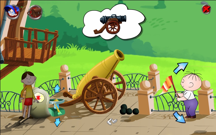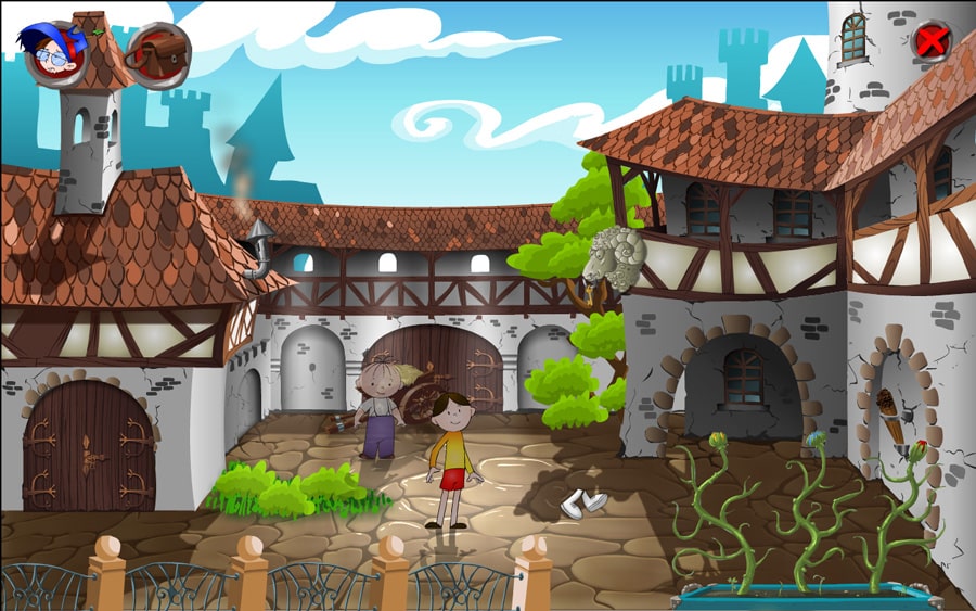 Od razu uderzyła mnie czytelność menu. Wróć do gry, nowa gra, wyjdź z gry, autorzy. Pierwsze trzy po najechaniu kursorem są czytane. Nowa gra? Pojawia się ptaszek i krzyżyk oraz odpowiednio nagrane tak, nie. W tym momencie aż zdziwiłam się, że gra jest przeznaczona dla 6+, bo całość przypominała mi bardziej zabawki Fisher Price dla dwulatków. Zaczynając rozgrywkę przywitało mnie rysunkowe intro i żarty na temat map oraz GPS’u, co wydało mi się bardziej skierowane do starszej publiczności. Całość zaczyna się od błędów w nawigacji, przez które Bolek i Lolek trafiają do tytułowego Tajemniczego Zamczyska, zamiast do schroniska Górskie Powietrze, które było celem ich podróży. Na miejscu wita ich magister alchemii, nauk tajemnych i wszelkich innych – Zygfryd Ponury (dziwne, że nie profesor) i w dużym skrócie każe im wykonywać polecenia swojego asystenta Szymona, pod groźbą umieszczenia obu chłopaków w lochu. Tu następuje najmniej przekonująca próba powiedzenia „nie, dziękuję, już idę” w historii dubbingu, po czym władza przechodzi w nasze ręce. Natychmiast uderza zmiana pogody – zaraz po przyjeździe do zamczyska niebo było pochmurne, przewijały się odgłosy wichury, a tu nagle słońce świeci, zmiana muzyki i wszystko jest już pięknie. Nie ważne jednak, otrzymaliśmy pierwsze zadanie od Szymona (tak, tak, nawiązanie do gry Szymon Mówi) i zabieramy się do roboty. Całość naszych działań ma przysłużyć się ukończeniu eksperymentu magistra Zygfryda.