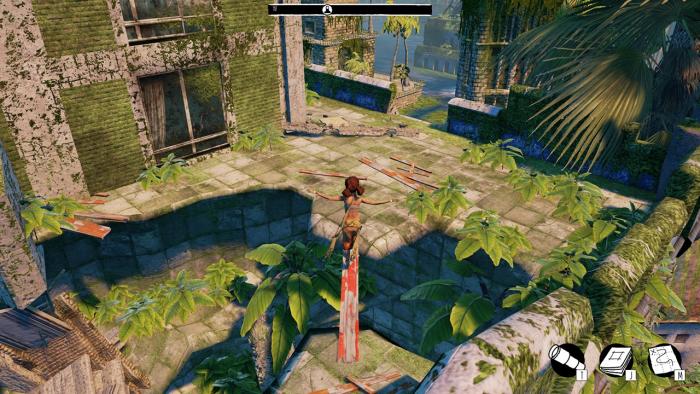 Większą część obszaru przemierzamy na łodzi, więc za bardzo nie trzeba się martwić, że heroina nie ma kondycji i porusza się lekkim truchtem. Nawet nie wiem czy umie pływać, ponieważ gra zabrania wychodzenia poza krawędzi, restrykcyjnie ograniczając ruchy gracza. W tym sensie można powiedzieć, że jest bardzo liniowa. Każdy z budynków ma wyraźnie zaznaczoną ścieżkę, np. wspinasz się tam, gdzie rosną kwiatki. Chociaż by zebrać wszystkie dzienniki, labirynty budynków przemierzałam ze dwa – trzy razy, zanim odnalazłam ukrytą ścieżkę za winklem (w każdym z głównych budynków gdzie można odnaleźć zapasy, są ok. cztery dzienniki). Późniejsze odwiedziny w zasadzie nie wchodziły w grę, ponieważ po odkryciu zapasów bohaterka automatycznie wraca do bazy i oszczędza to całej drogi w dół. Często jednak ścieżki, które prowadziły do znajdziek wydawały mi się na to zbyt oczywiste i podążając dalej trudniejszą drogą natrafiałam na zapasy. Przygodówkowe oko wyraźnie nie jest tu honorowane.