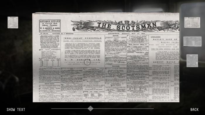 Twórcy naprawdę wzięli sobie za punkt honoru, by stworzyć jak najbardziej autentyczne otoczenie. Dzięki współpracy z National Library of Scotland, The Observer, The Scotsman Publications oraz Citizens Theatre wykreowali praktycznie historyczny obraz Wielkiej Brytanii. Podczas gdy w książce tylko czytamy o tym co było w gazecie, 39 steps pokazuje nam całą gazetę, którą możemy normalnie przeczytać razem z reklamami mody męskiej i kapeluszy do Ascot. Dlatego na początku wspomniałam, że jest to właściwie wydanie specjalne The Thirty-Nine Steps. Zwizualizowana jest każda lokacja ujęta w książce, niektóre w ujęciu z różnych kątów. Sama rozgrywka zajęła mi pięć i pół godziny, a akcja jest naprawdę wartka, więc nawet sama nie wiem ile zajęło namalowanie tego wszystkiego. Użyto także historycznych zdjęć i map, tam gdzie było to stosowne. Dodatkowo uraczy nas spora liczba świetnie odegranych dialogów. Do tego stopnia, że prawdopodobnie nie ja jedna miałabym spory problem przez akcent w Szkocji, gdyby nie wyświetlane napisy. Szczerze mówiąc, głosy postaci są tak dobrze odegrane, że to chyba najlepszy dubbing jaki słyszałam dotąd w grach video.